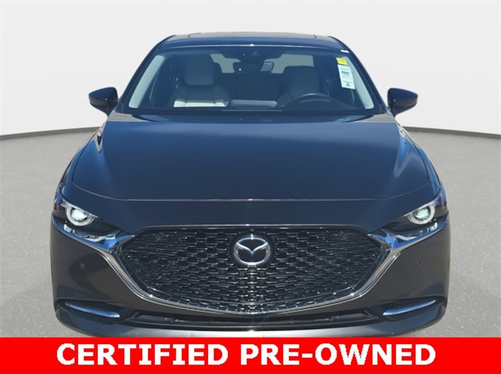 *MAZDA CERTIFIED*, *INCLUDES WARRANTY*, *BACKUP CAMERA*, *BLUETOOTH*, *NAVIGATION*, *APPLE CARPLAY/ANDROID AUTO*, *ALUMINUM ALLOY WHEELS*, Mazda3 Premium Plus AWD, 4D Sedan, I4, 6-Speed Automatic, AWD, Machine Gray Metallic, White w/Leather Seat Trim, 4-Wheel Disc Brakes, ABS brakes, Air Conditioning, Alloy wheels, AppLink/Apple CarPlay and Android Auto, Front Bucket Seats, Heads-Up Display, Heated front seats, Heated Front Sport Seats, Heated steering wheel, Leather Seat Trim, Memory seat, Navigation System, Panic alarm, Power driver seat, Power moonroof, Power windows, Premium Plus Package, Remote keyless entry, Speed control, Split folding rear seat, Spoiler, Steering wheel mounted audio controls, Telescoping steering wheel, Tilt steering wheel, Traction control, Wheels: 18" x 7J Black Finish Alloy.